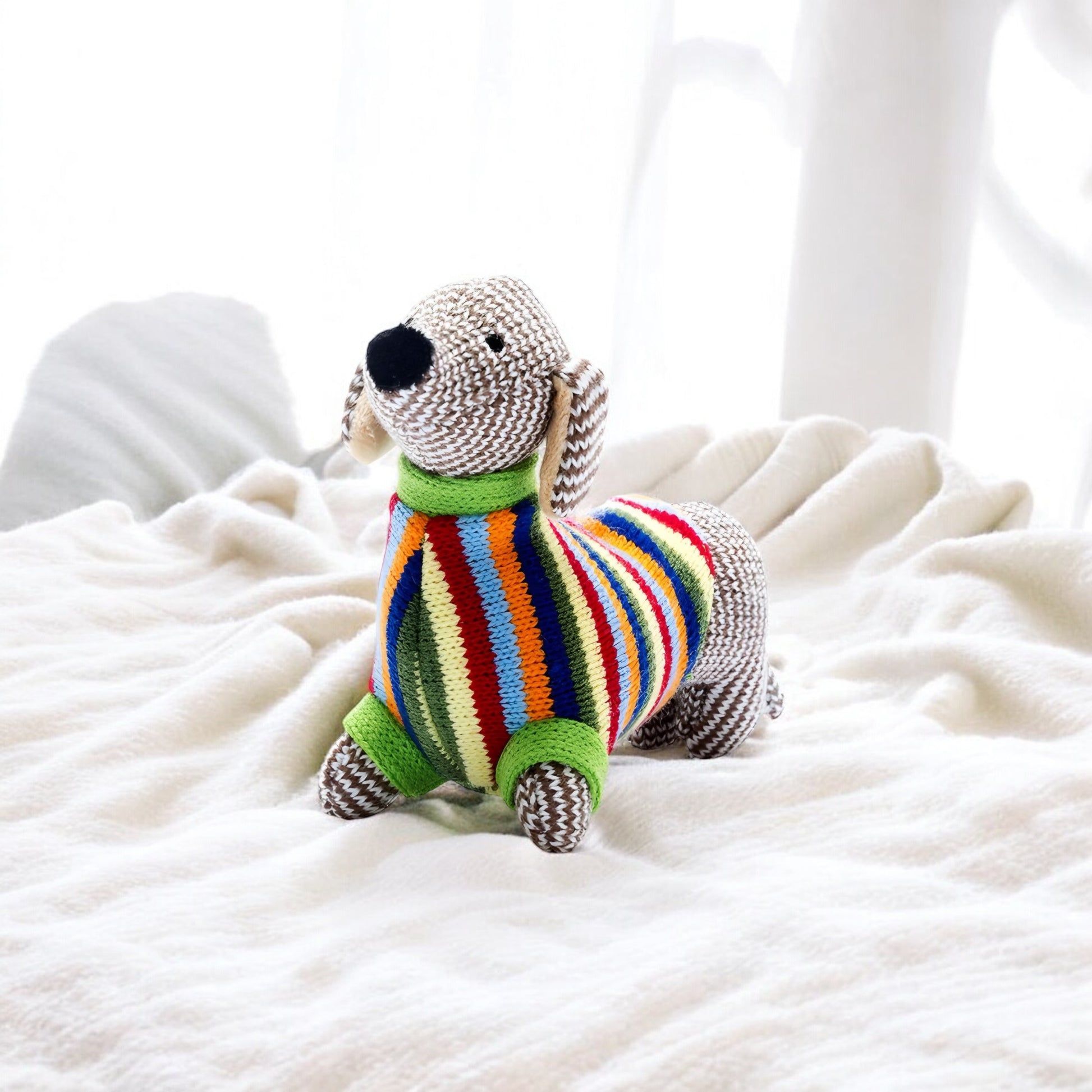 Knitted Sausage Dog Rattle with a unique rainbow stripe sweater. Have you seen a real sausage dog in this sweater, they do exist! Incredibly soft and cute as well as robust & tactile. These knitted rattles are an ideal gift for any baby or young child. Watch their faces as the toy makes a traditional rattle sound as they shake it!
