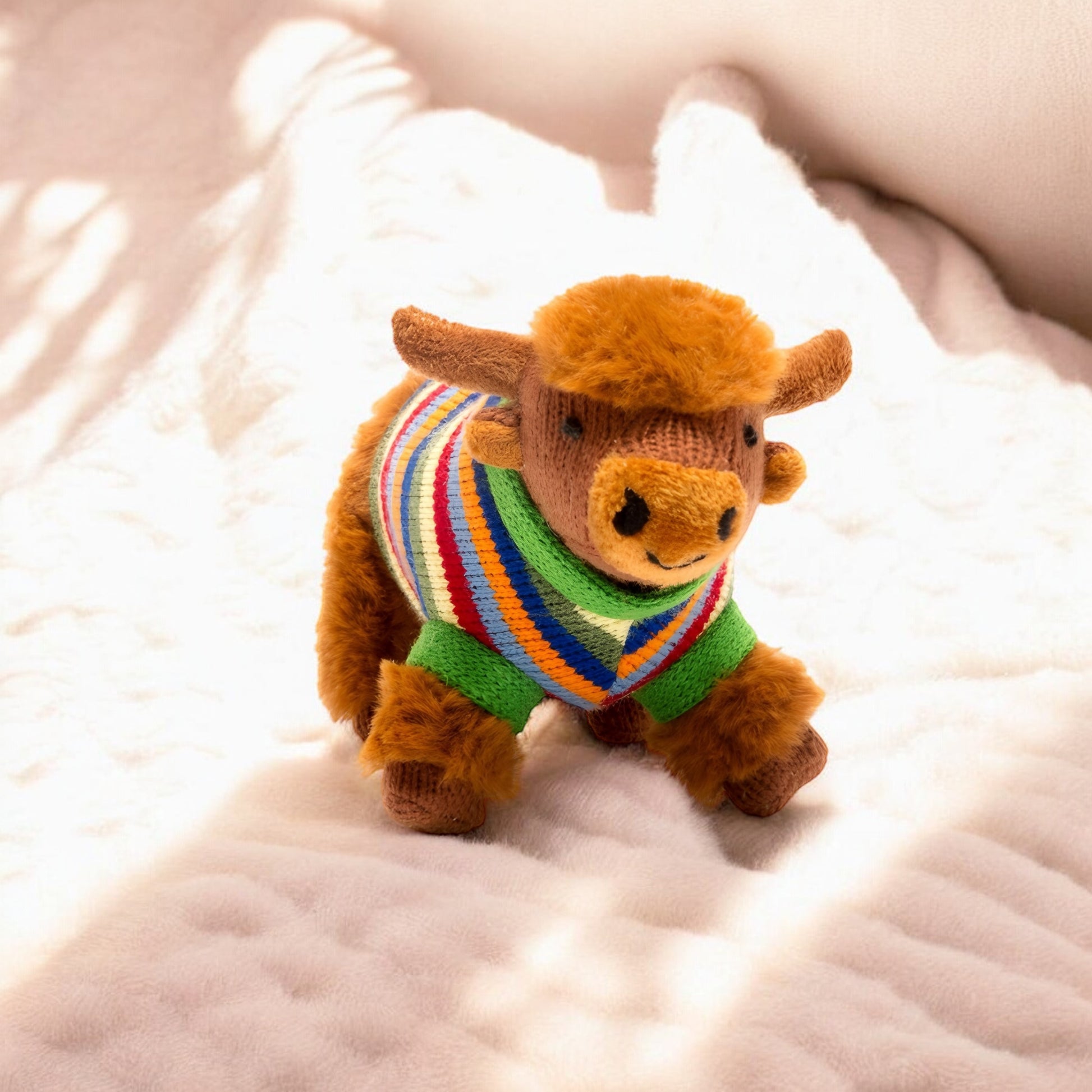 Knitted Highland Cow Rattle With Rainbow Stripe Sweater